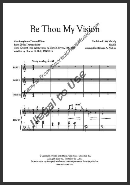 Includes the full transposed score, piano accompaniment and parts 1, 2 & 3 for E-flat Alto Saxophone.