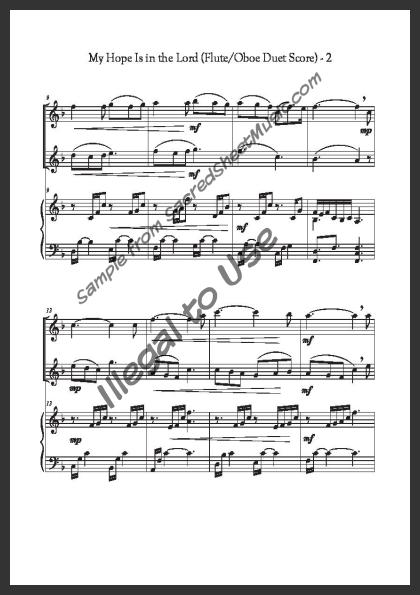 Includes the full score with piano accompaniment and separate duet parts for Flute I and Oboe II.
