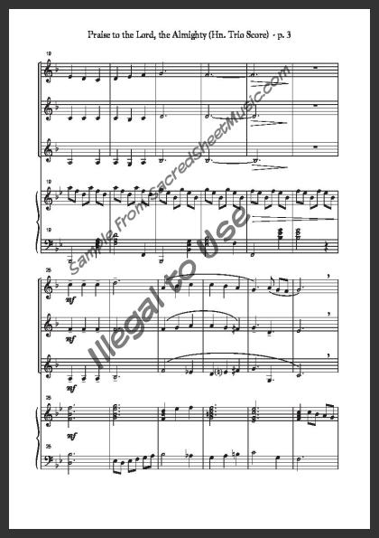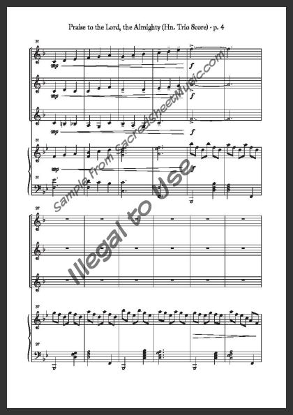 A three-part arrangement for three horns with piano accompaniment. A majestic, flowing setting of this great hymn of praise to our Creator and Savior – ‘Praise to the Lord, the Almighty, the King of creation! … Join me in glad adoration.’ Moderate level of difficulty.