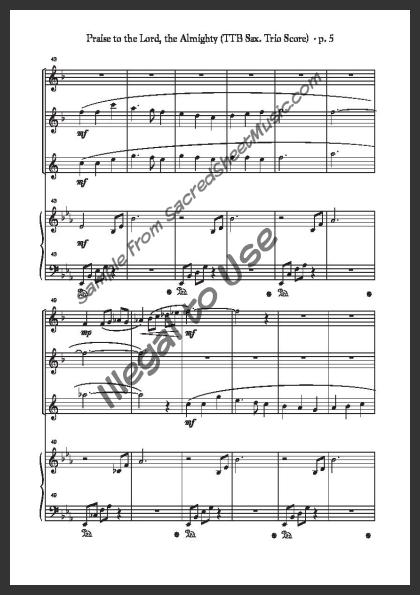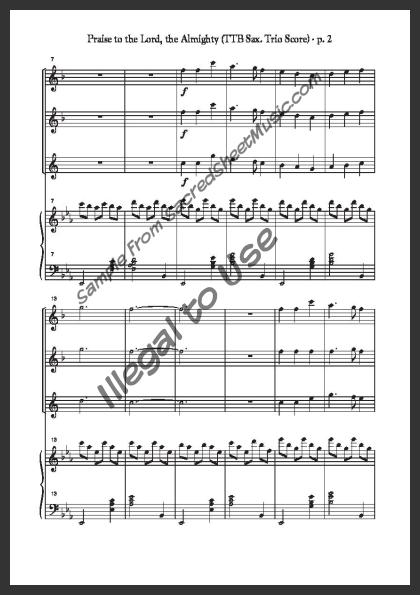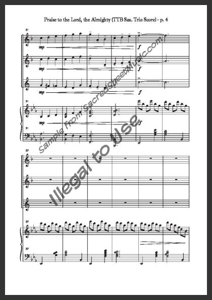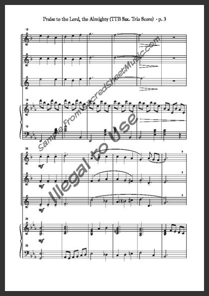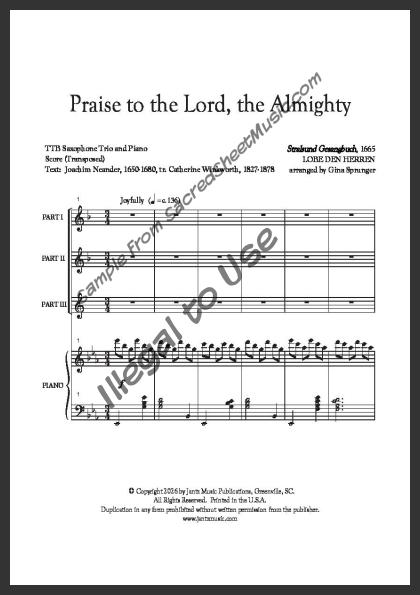 A three-part arrangement for a mixed saxophone combination of two tenor saxophones and one baritone saxophone with piano accompaniment. A majestic, flowing setting of this great hymn of praise to our Creator and Savior – ‘Praise to the Lord, the Almighty, the King of creation! … Join me in glad adoration.’ Moderate level of difficulty.